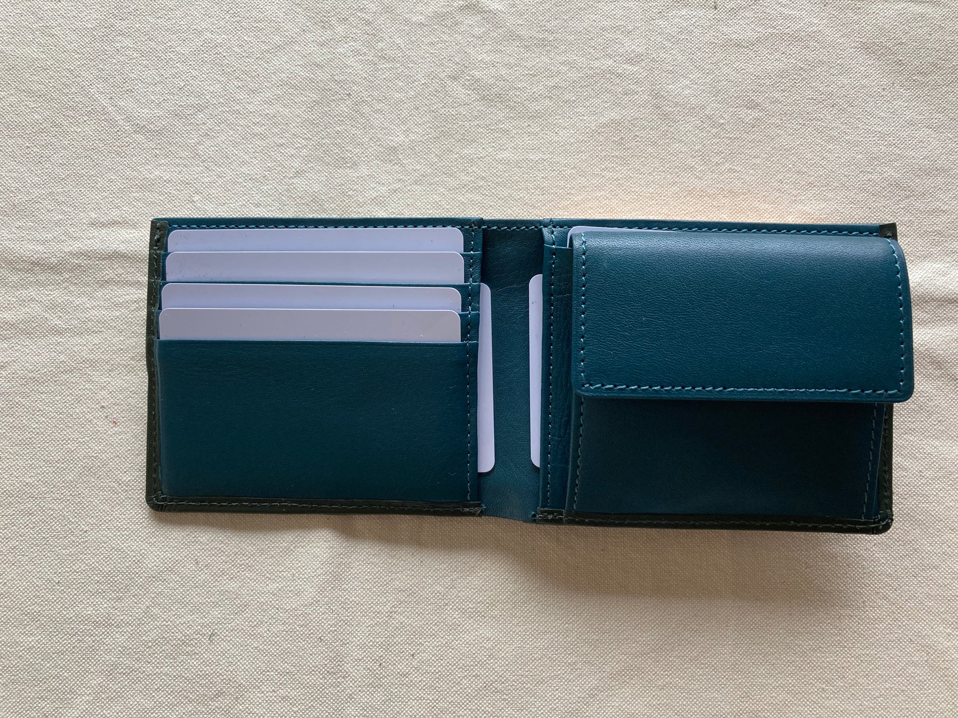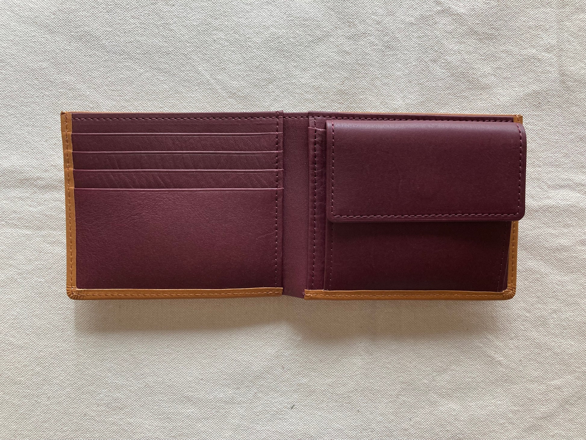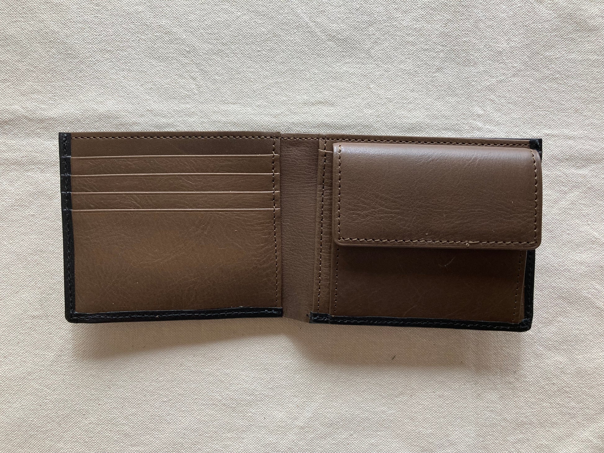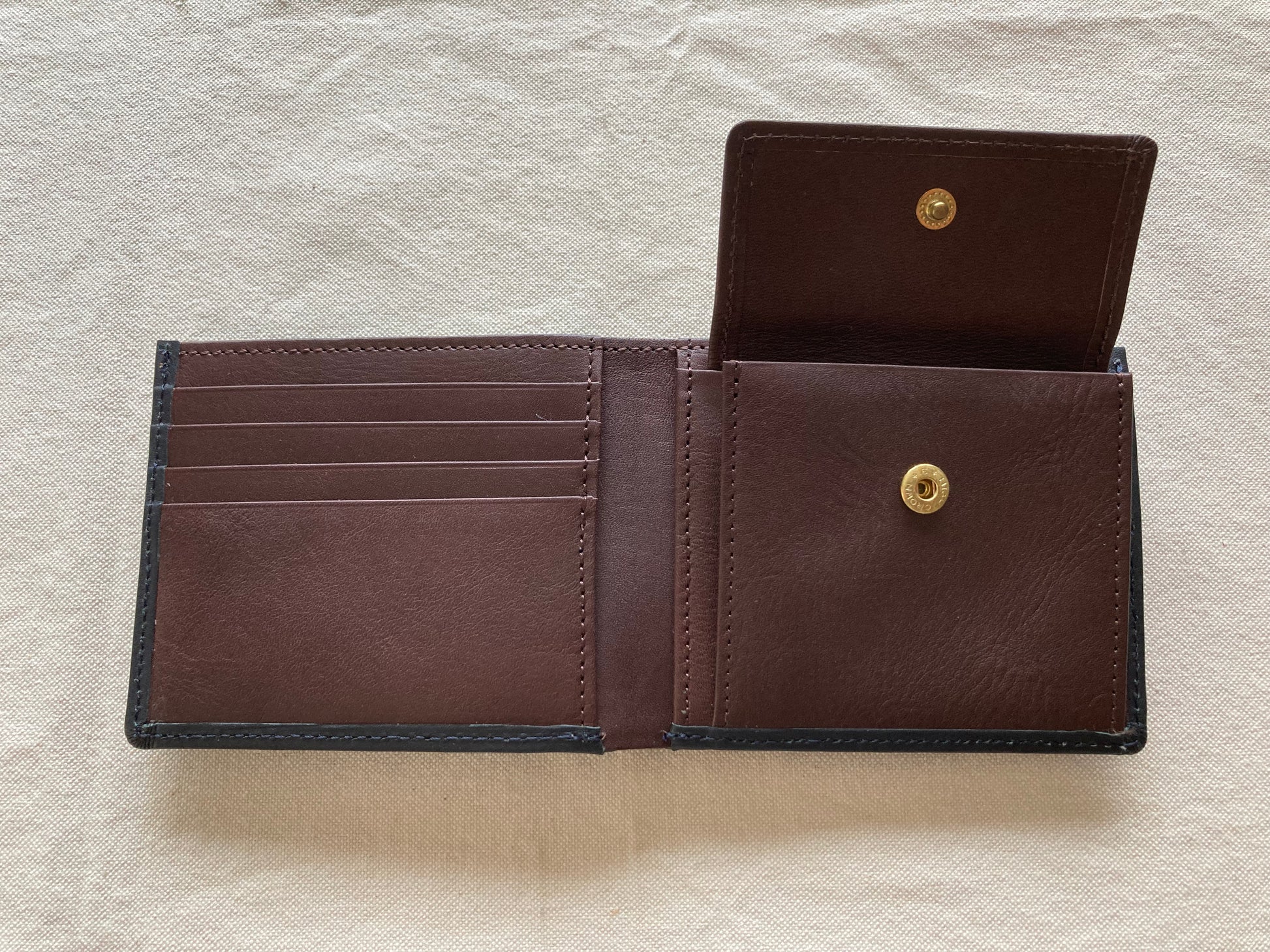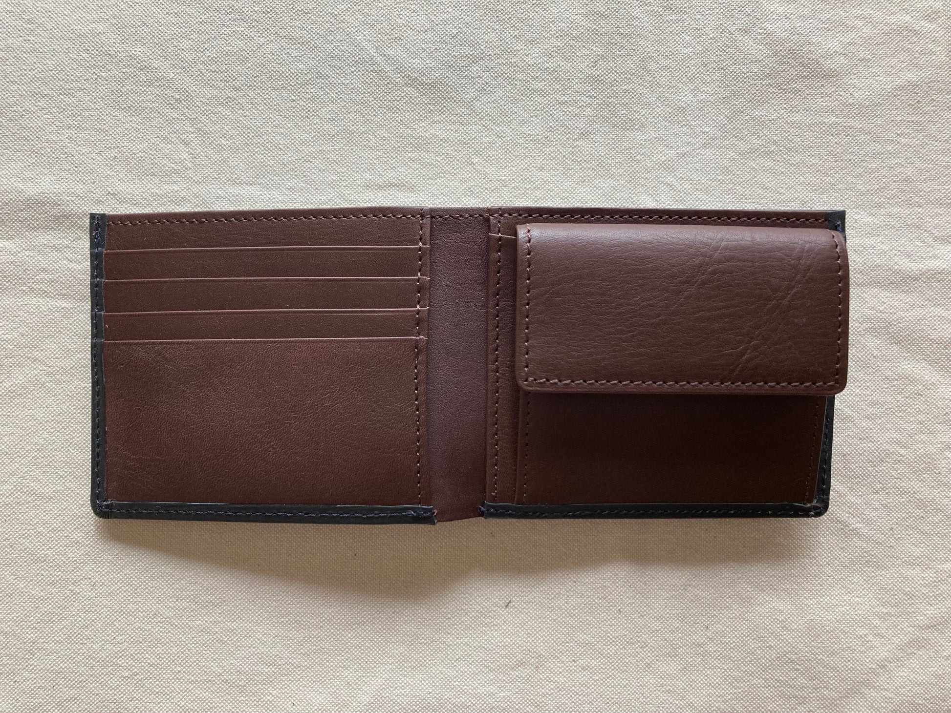 シンプルかつオーソドックスなデザインで、開いた左側にカード4段、右側はコインポケットとなっております。札室には仕切りがあり金種により仕分けや、紙幣とレシートに分けて保管出来ます。