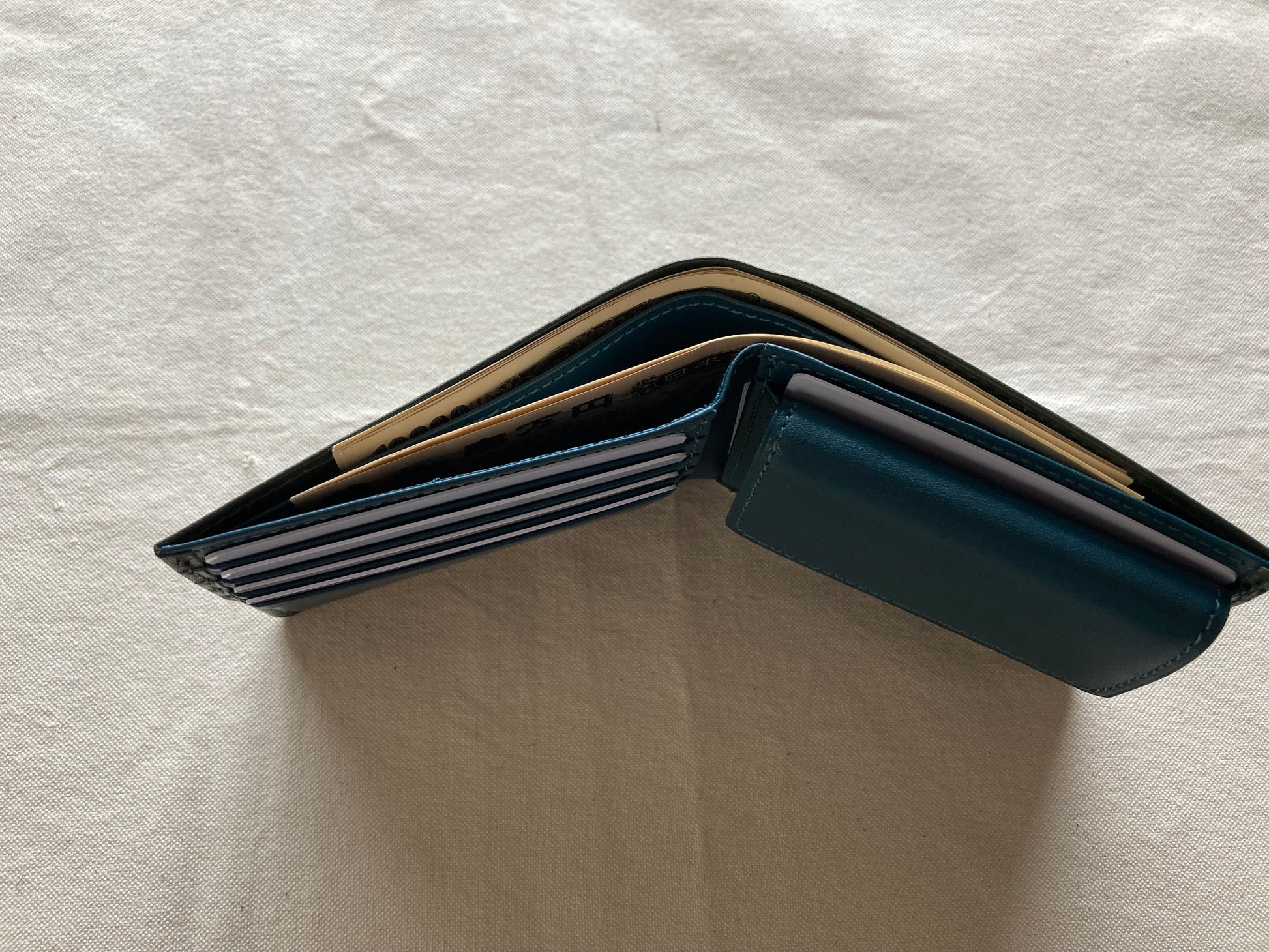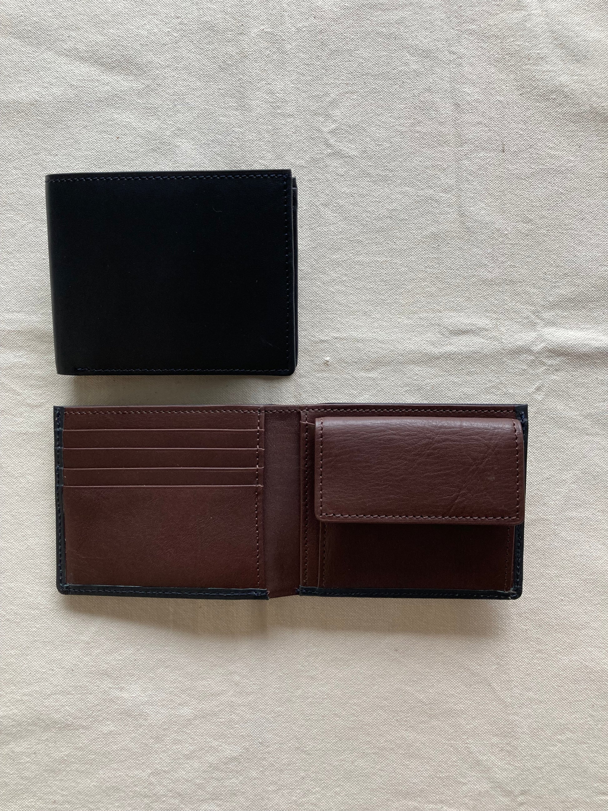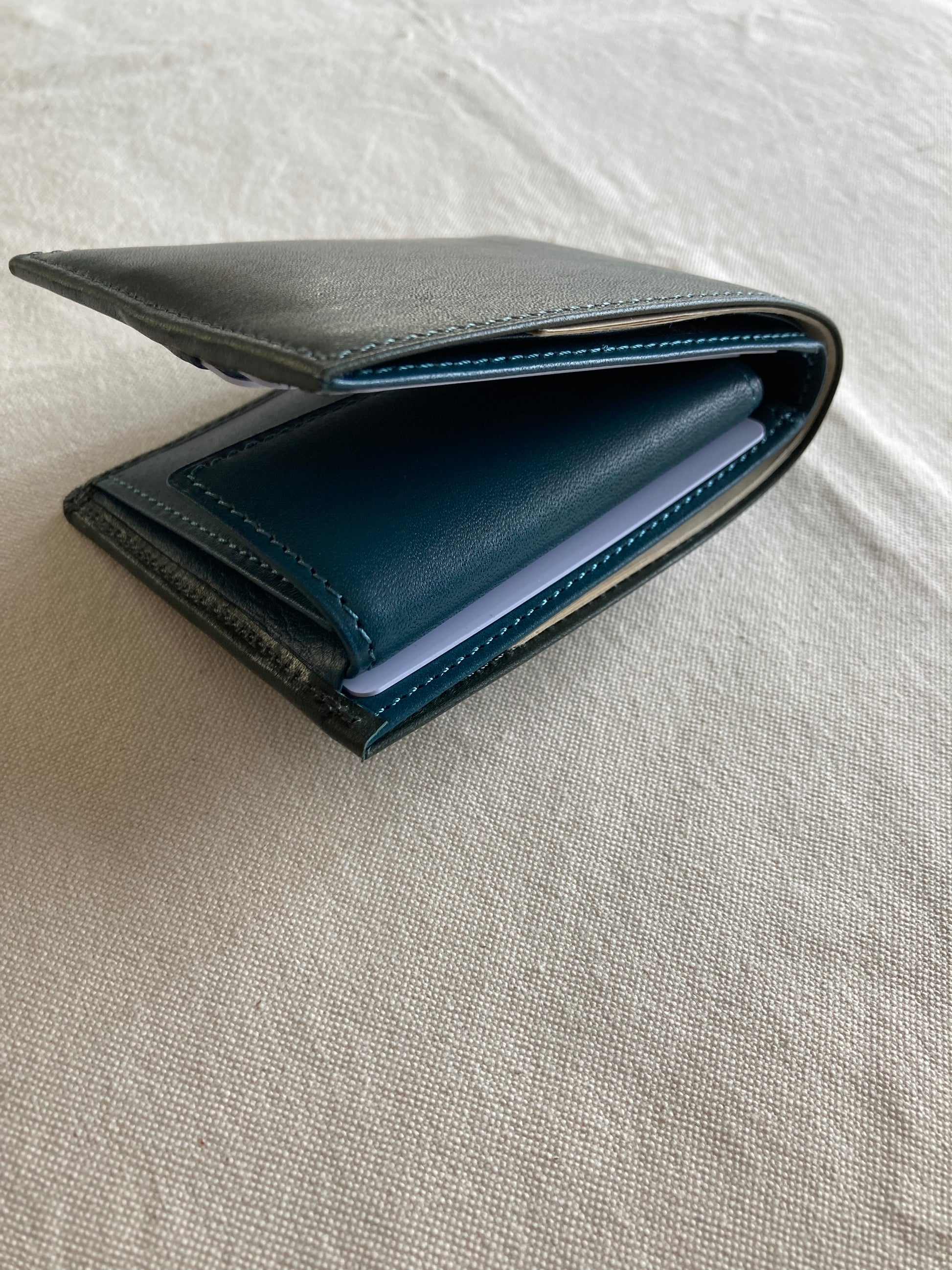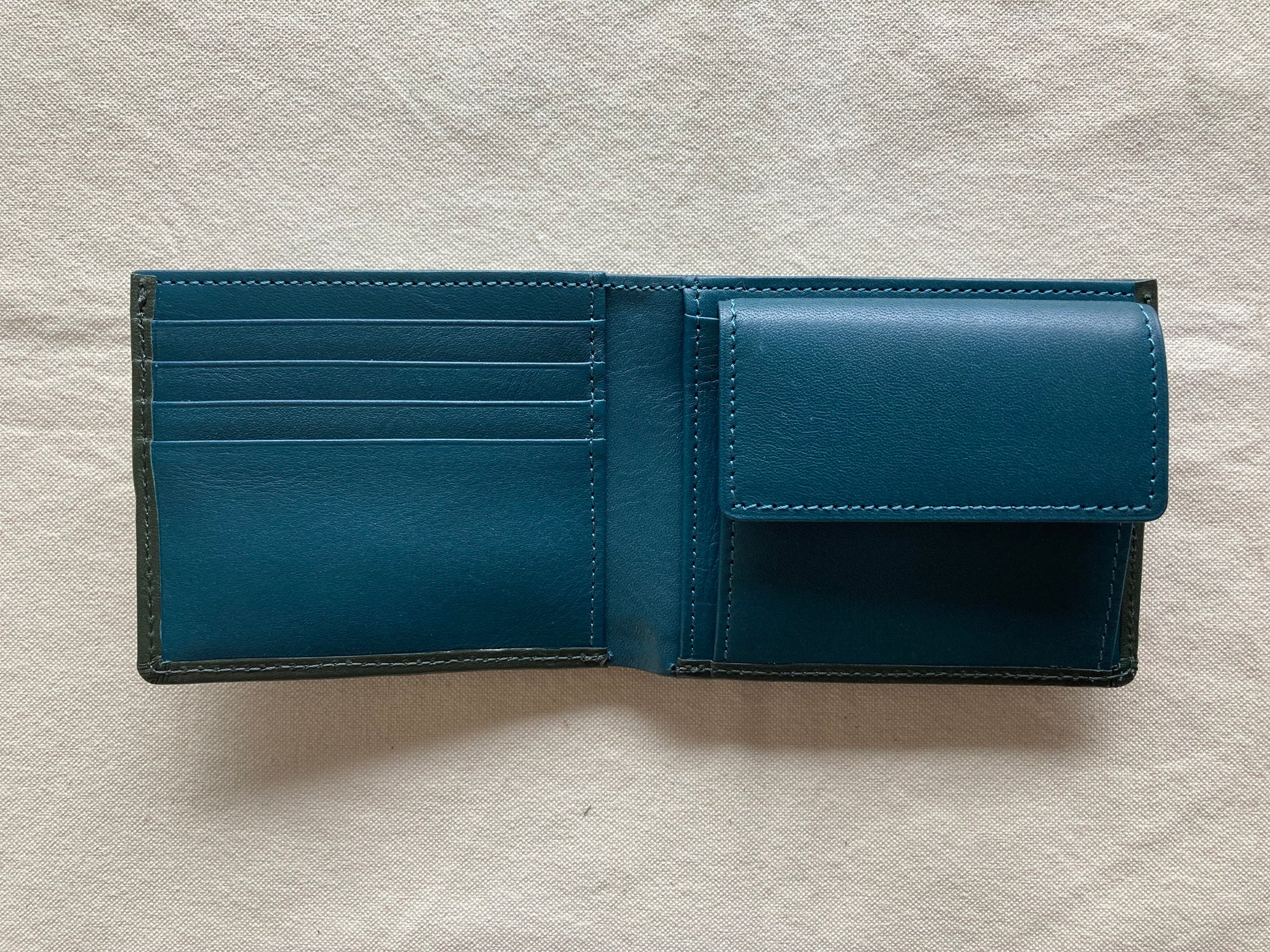 シンプルかつオーソドックスなデザインで、開いた左側にカード4段、右側はコインポケットとなっております。札室には仕切りがあり金種により仕分けや、紙幣とレシートに分けて保管出来ます。