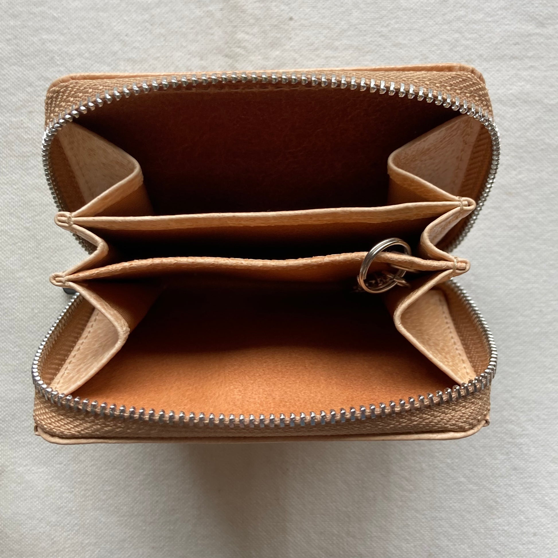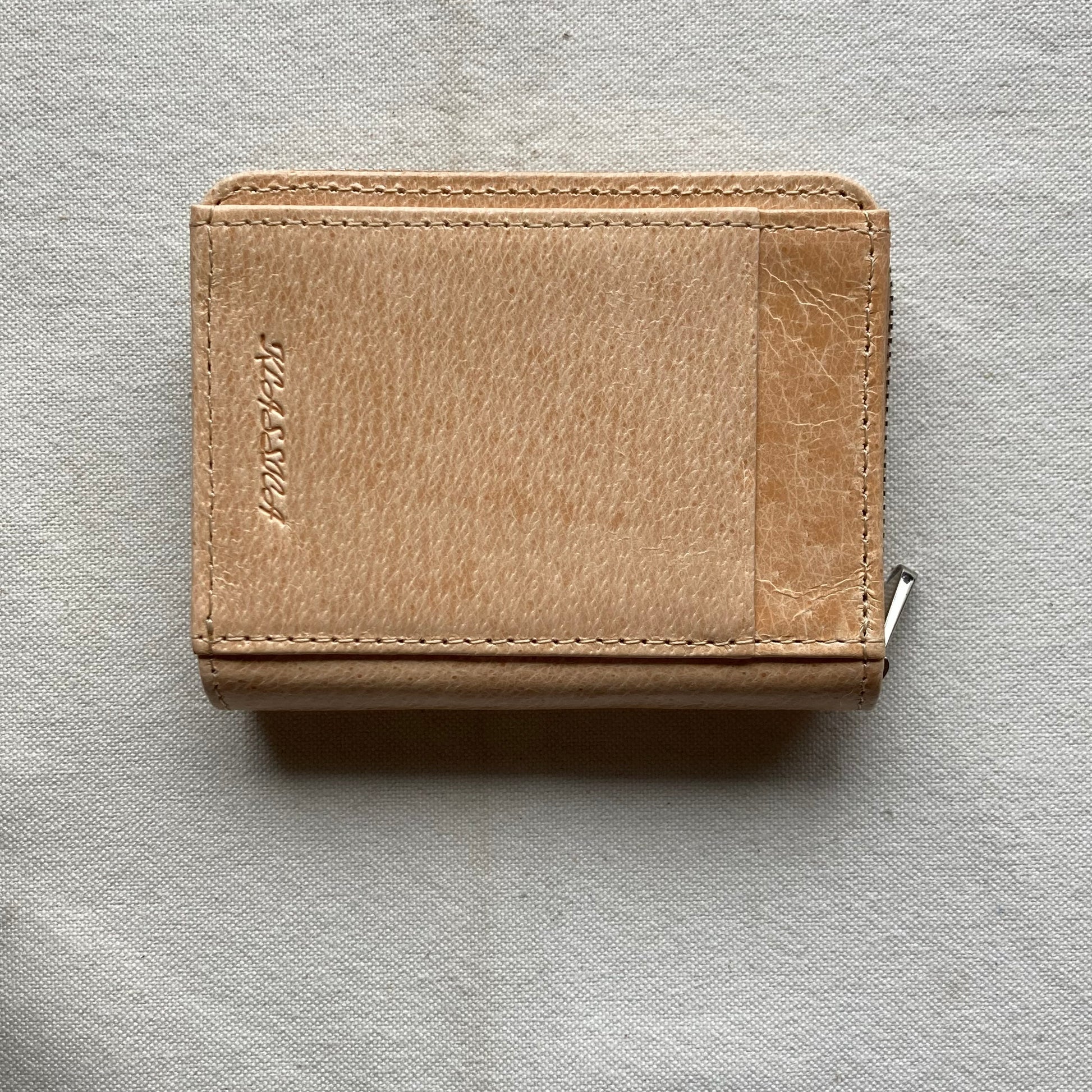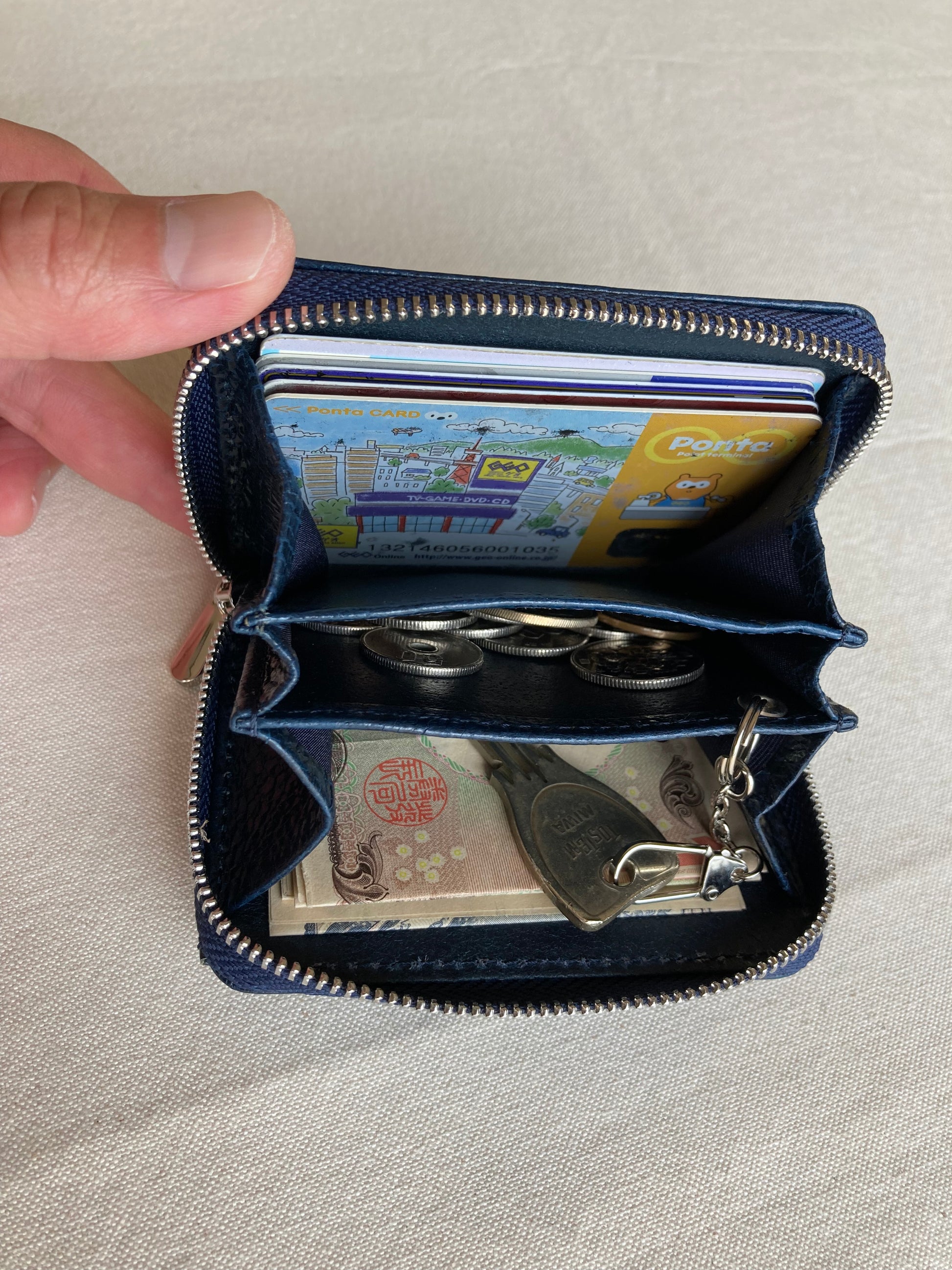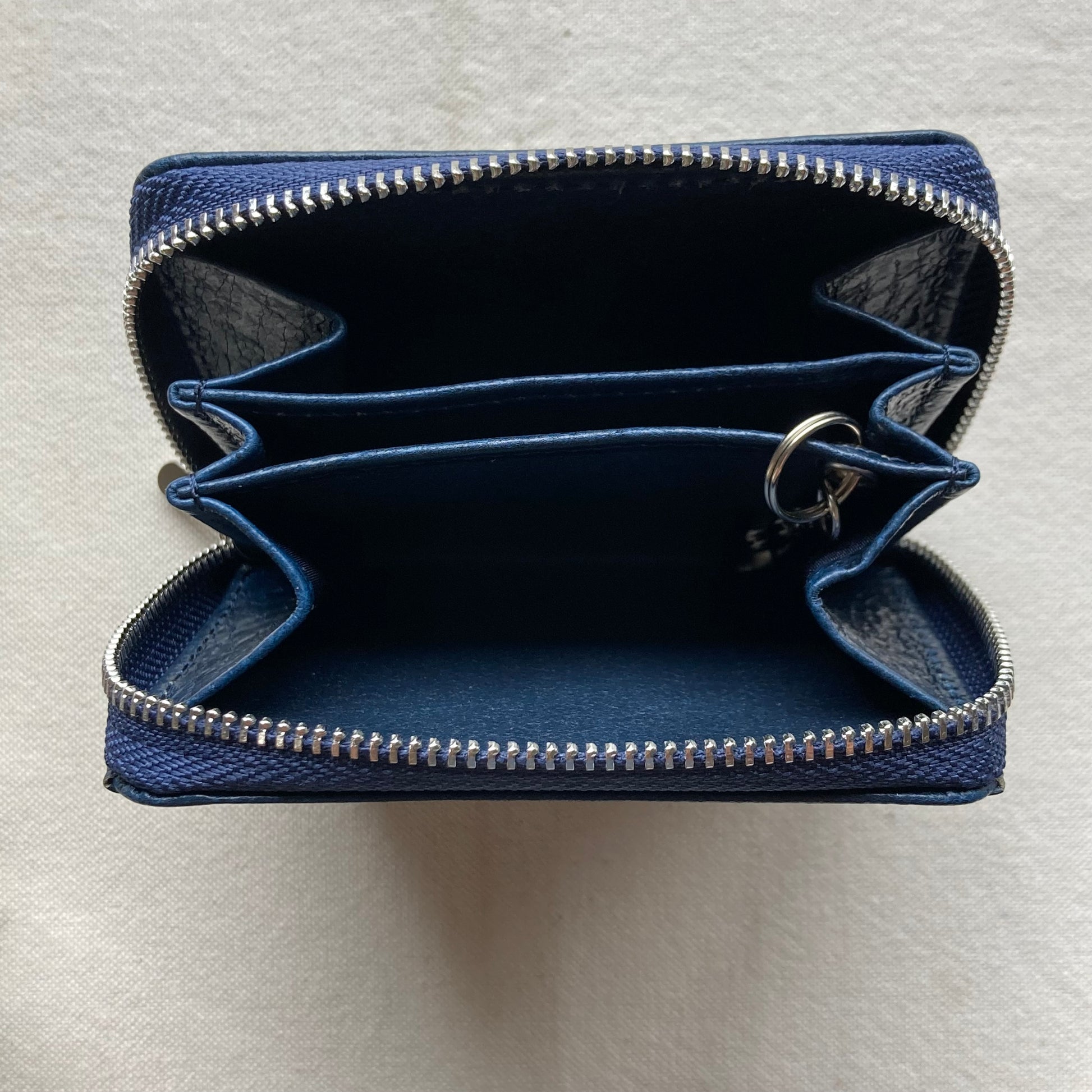 ラウンド3方ファスナータイプのコインケース。表側にセル窓のカードポケットともう一方側には2ッのカードポケット。内側は3ッのスペースに仕切られ、キーチェーンが1ッ付いています。小銭・折った紙幣とカードを分けて収納し、見やすさ取り出し易さが特徴です。